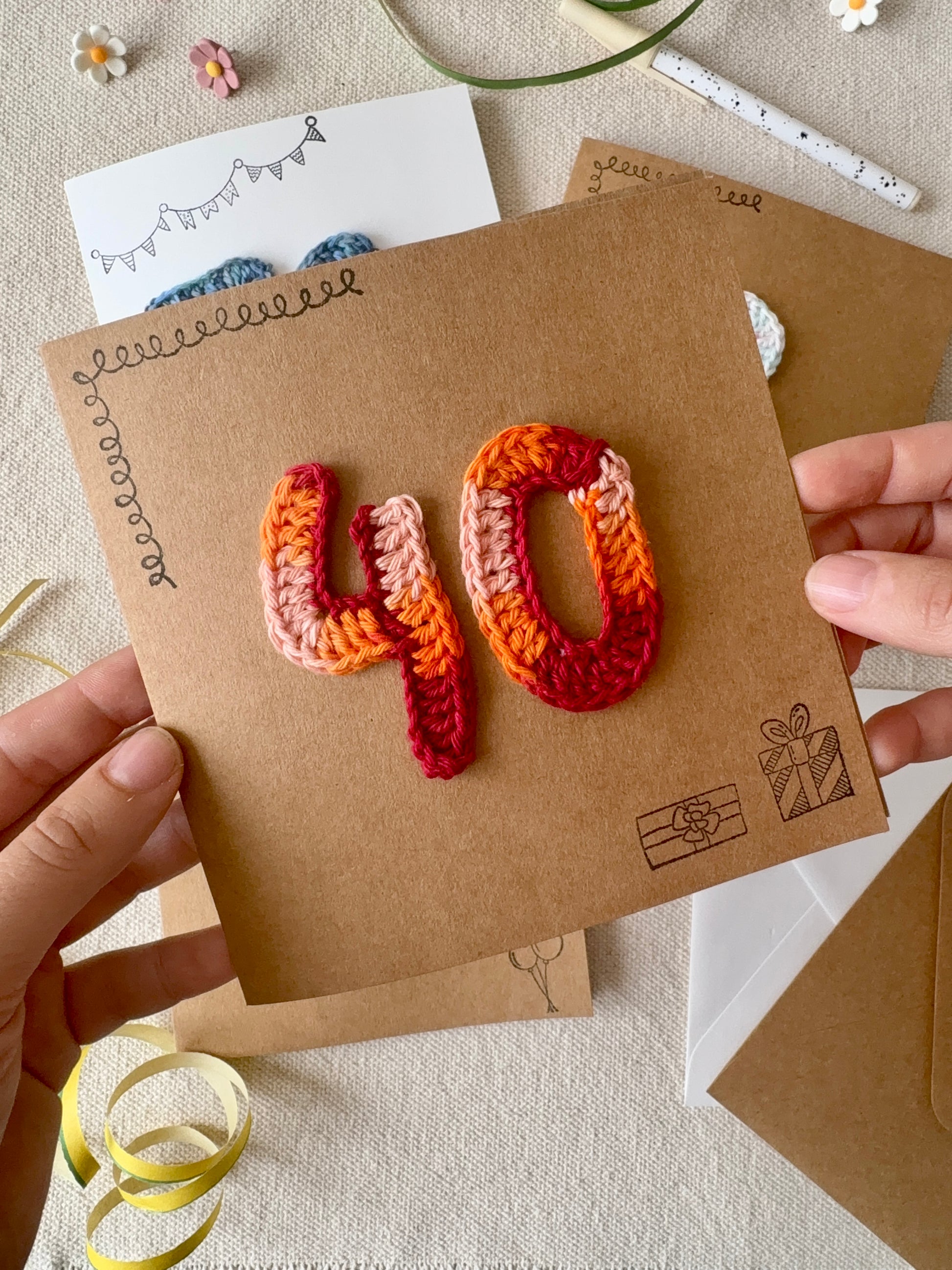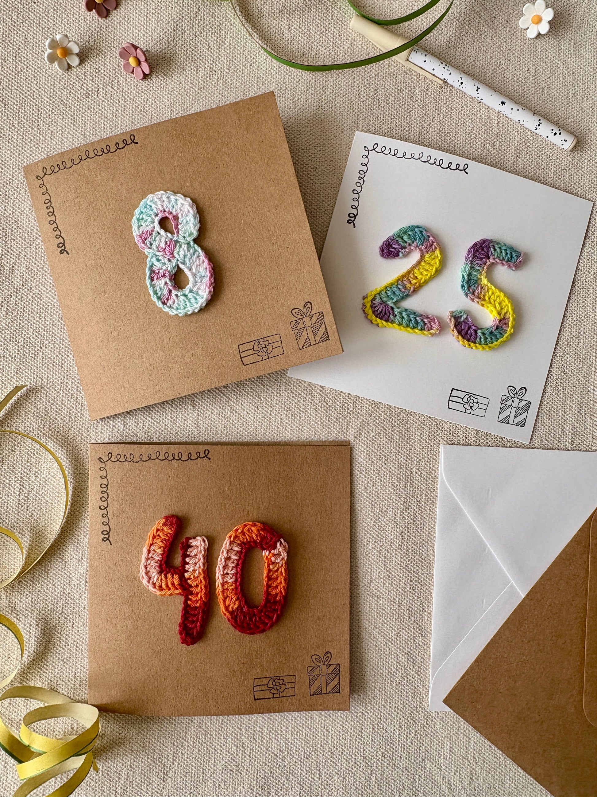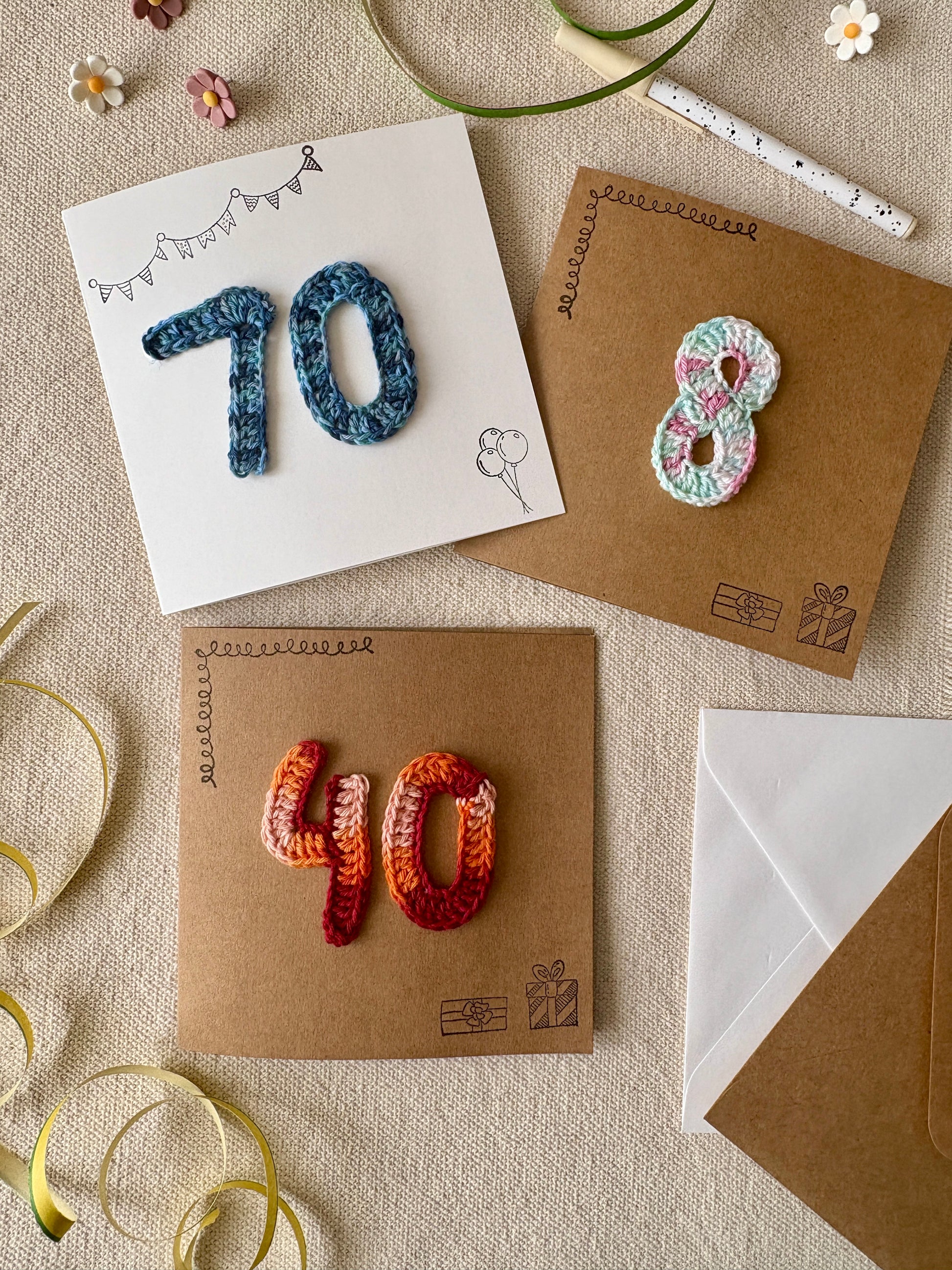 Chaque carte est décorée d’un chiffre crocheté à la main, pour marquer l’âge du destinataire avec originalité et douceur.